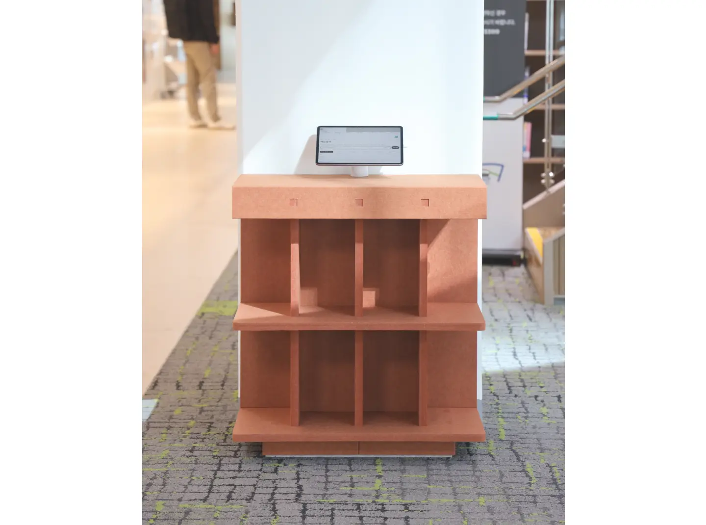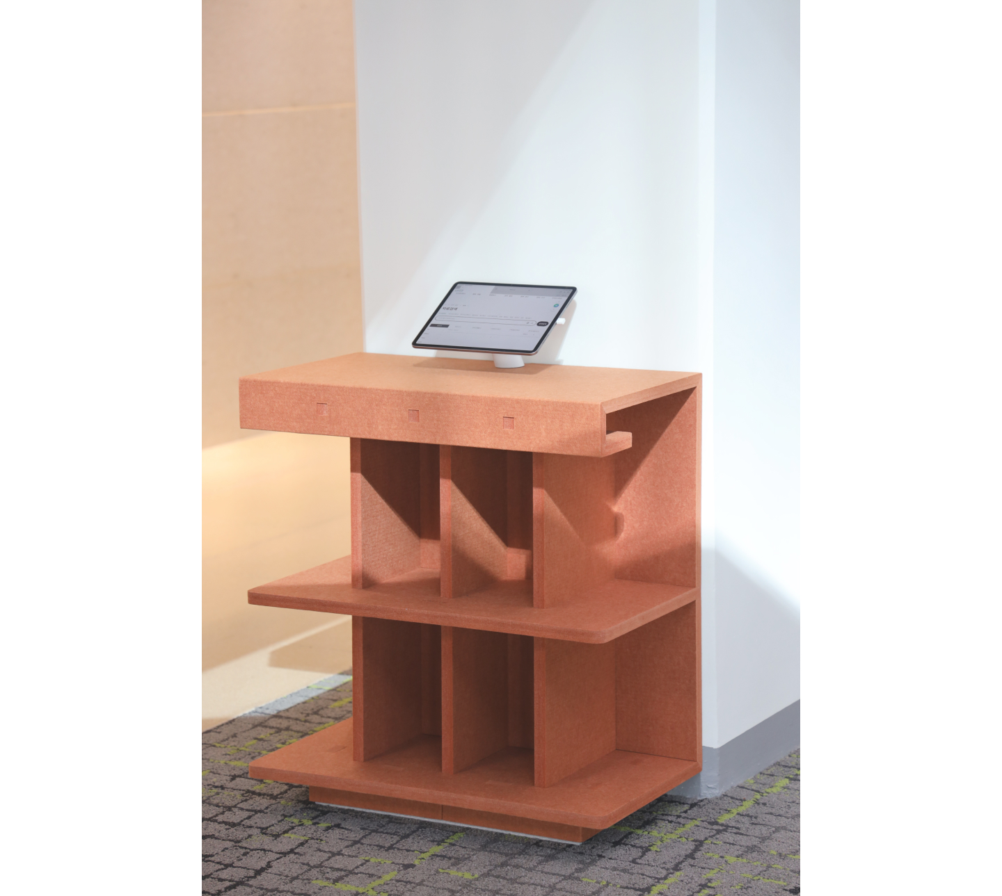 경기도서관의 도서거치대와 정보검색대로 사용하기 위해서 tonestin의 PET FOLD DESK가 적용되었습니다. 조용한 환경이 필수적인 도서관의 환경에서, 어쿠스틱 흡음소재인 PET를 100% 사용한 'PET FOLD DESK'. 소재 본연의 기능과 조형을 살려 경기도서관의 환경에 녹아든 저희의PET FOLD DESK를, 지금, 경기도서관에서 만나보실수 있습니다.