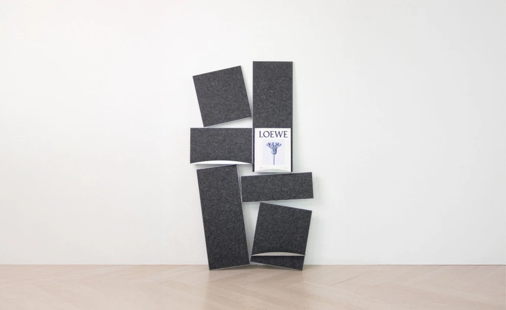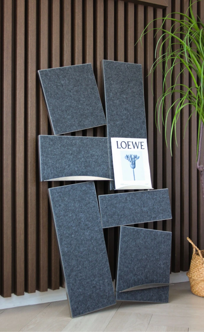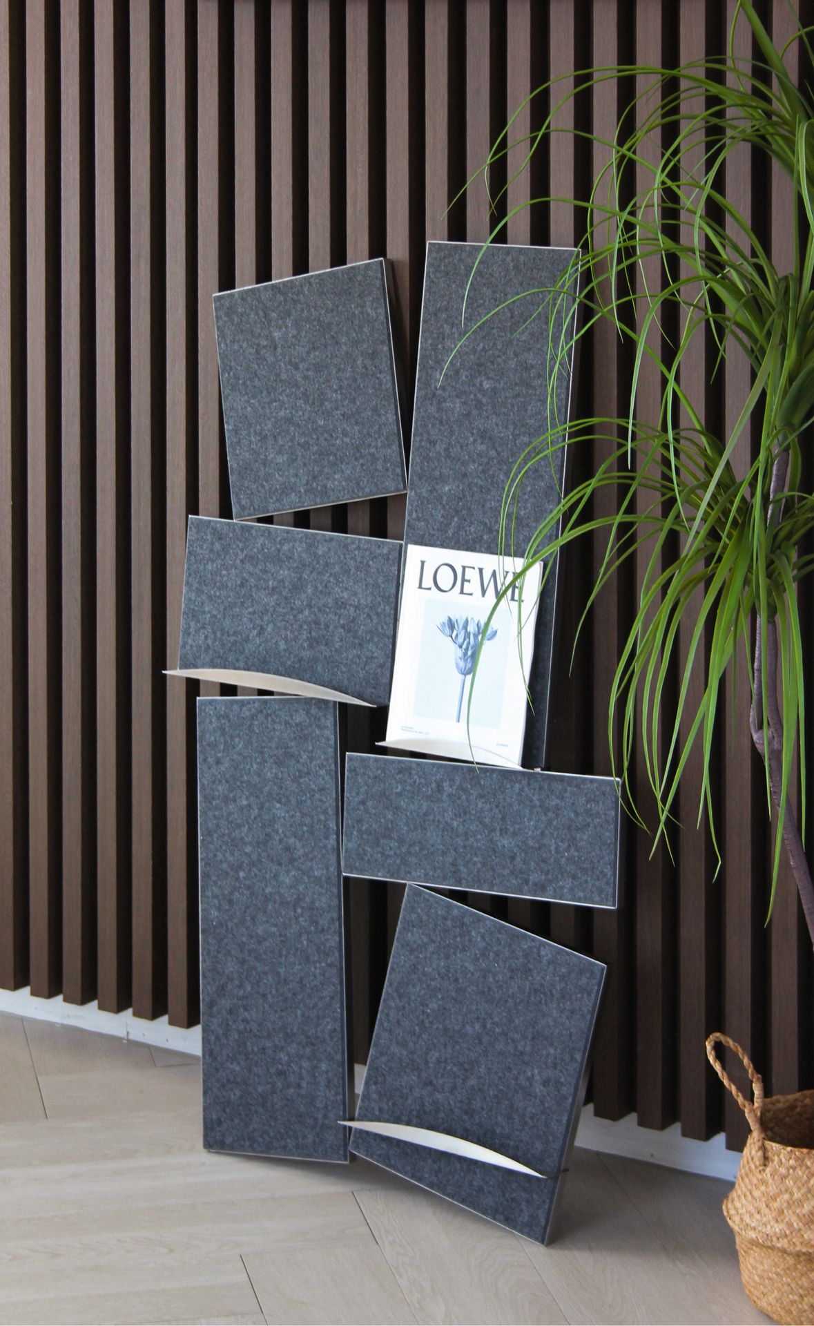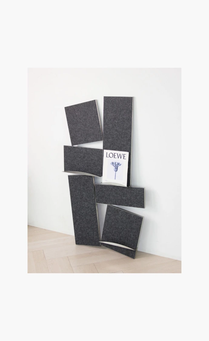 재활용 PET와 스테인리스 스틸을 결합해 제작한 매거진 렉입니다. 흡음 기능을 지닌 PET 패널과 이를 둘러싼 스테인리스 스틸 프레임의 대비는 소재 간 긴장감과 명확한 경계를 만들어냅니다. 불규칙하게 쌓인 듯한 외형은 시각적 리듬과 긴장감을 형성하며, 이러한 구조를 구현하기 위해 각 패널의 금속 테두리 중 최소한의 지점만을 정밀하게 용접해 완성도를 높였습니다.