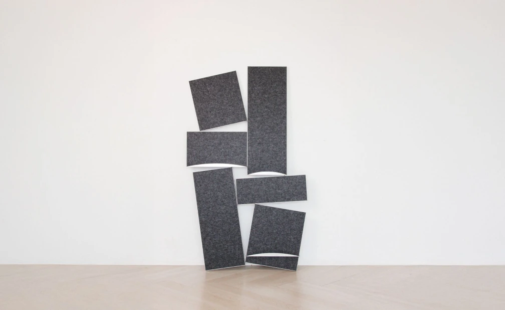 흡음 기능을 지닌 PET 패널과 이를 둘러싼 스테인리스 스틸 프레임의 대비는 소재 간 긴장감과 명확한 경계를 만들어냅니다.