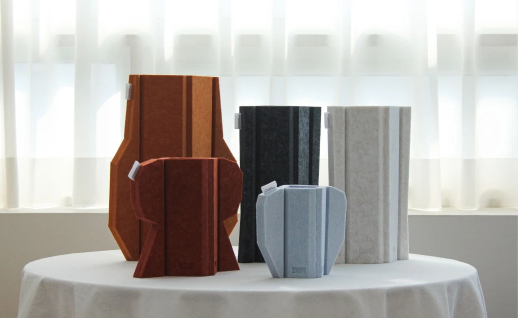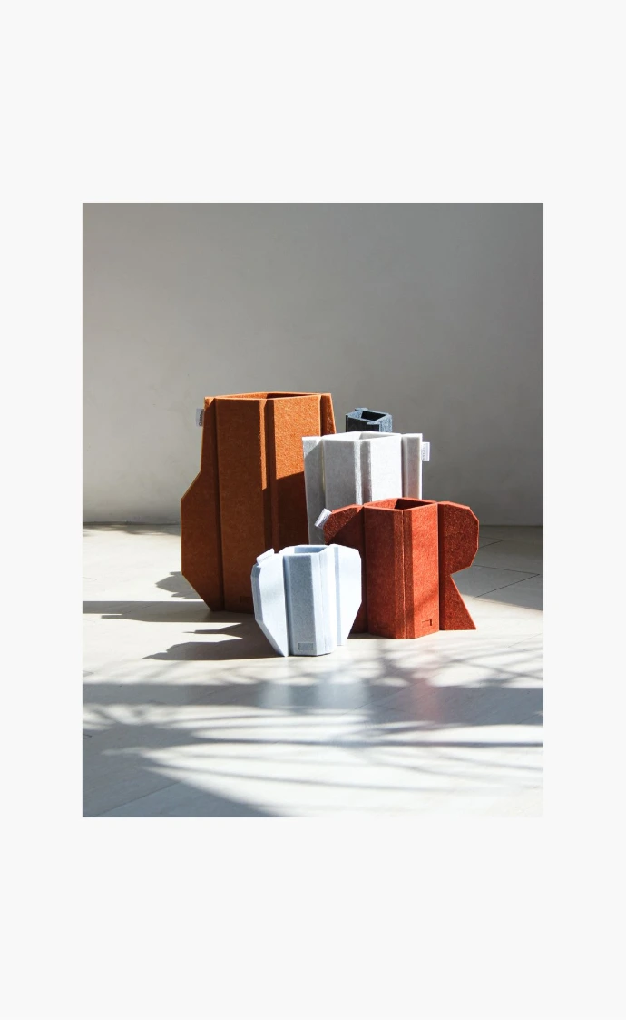 부드럽고 가벼운 PET 소재를 V-컷 가공으로 형상화한 화병 오브제입니다. V-컷으로 만들어진 유연한 곡면은 꽂는 대상에 따라 다양한 실루엣을 연출하며, 조형적 오브제로서의 존재감을 드러냅니다. 또한 화분이나 크기가 맞는 병을 내부에 담아 실제 화병으로 활용할 수 있어 조형성과 실사용 기능을 동시에 고려한 오브제로 완성되었습니다.