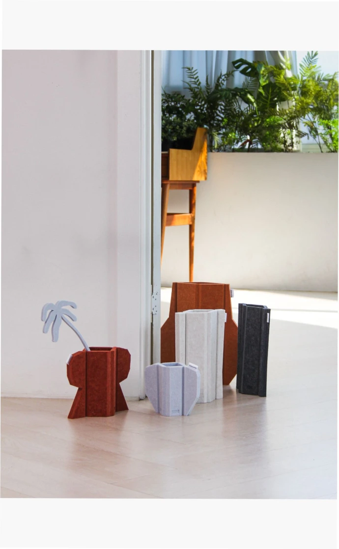 V-컷으로 만들어진 유연한 곡면은 꽂는 대상에 따라 다양한 실루엣을 연출하며, 조형적 오브제로서의 존재감을 드러냅니다.