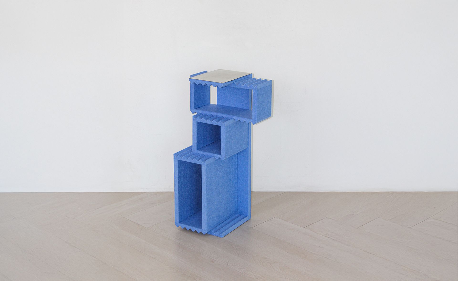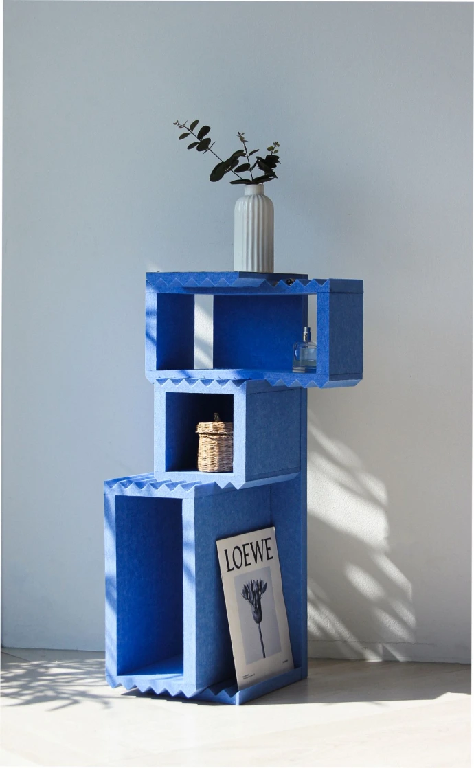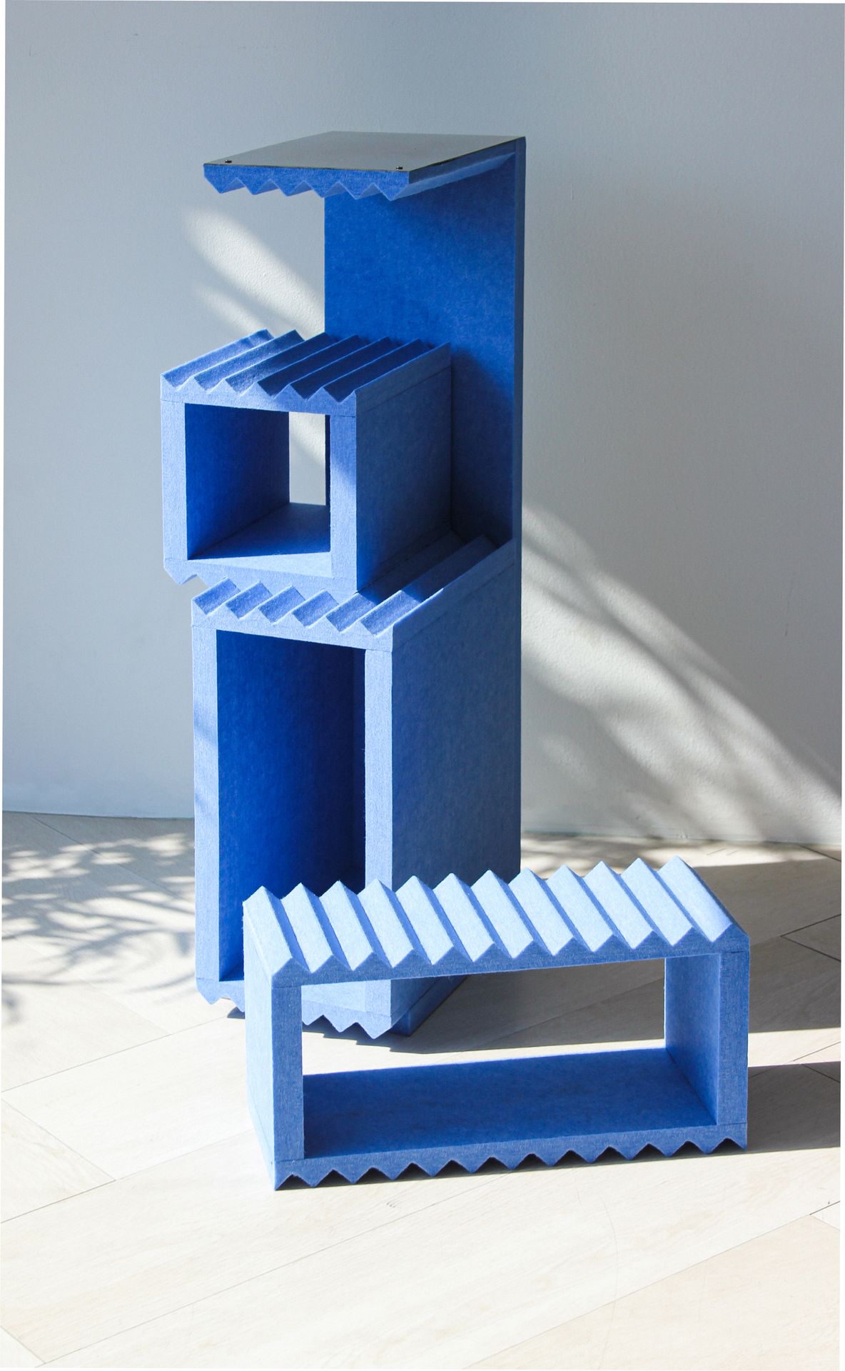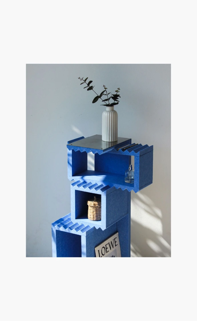 재생 PET 보드의 마찰력을 구조적으로 활용한 모듈형 선반입니다. V-커팅으로 가공된 보드를 기반으로 Frame과 3종의 Unit, 총 4가지 파츠를 조합해 사용자의 의도에 따라 자유로운 레이아웃 구성이 가능합니다. 벽에 고정하거나 바닥에 세워 사용하는 등 다양한 설치 방식에 대응하며, V-커팅 패턴은 Unit 간 결합을 하기 위한 연결 모듈로 작동하는 동시에, 수납물을 배치하는 자연스러운 가이드 역할을 합니다. 반복되는 커팅 면에서 발생하는 음영 대비는 보드에 독특한 볼륨감을 부여해 기능과 조형이 드러나는 오브제로 작동합니다.