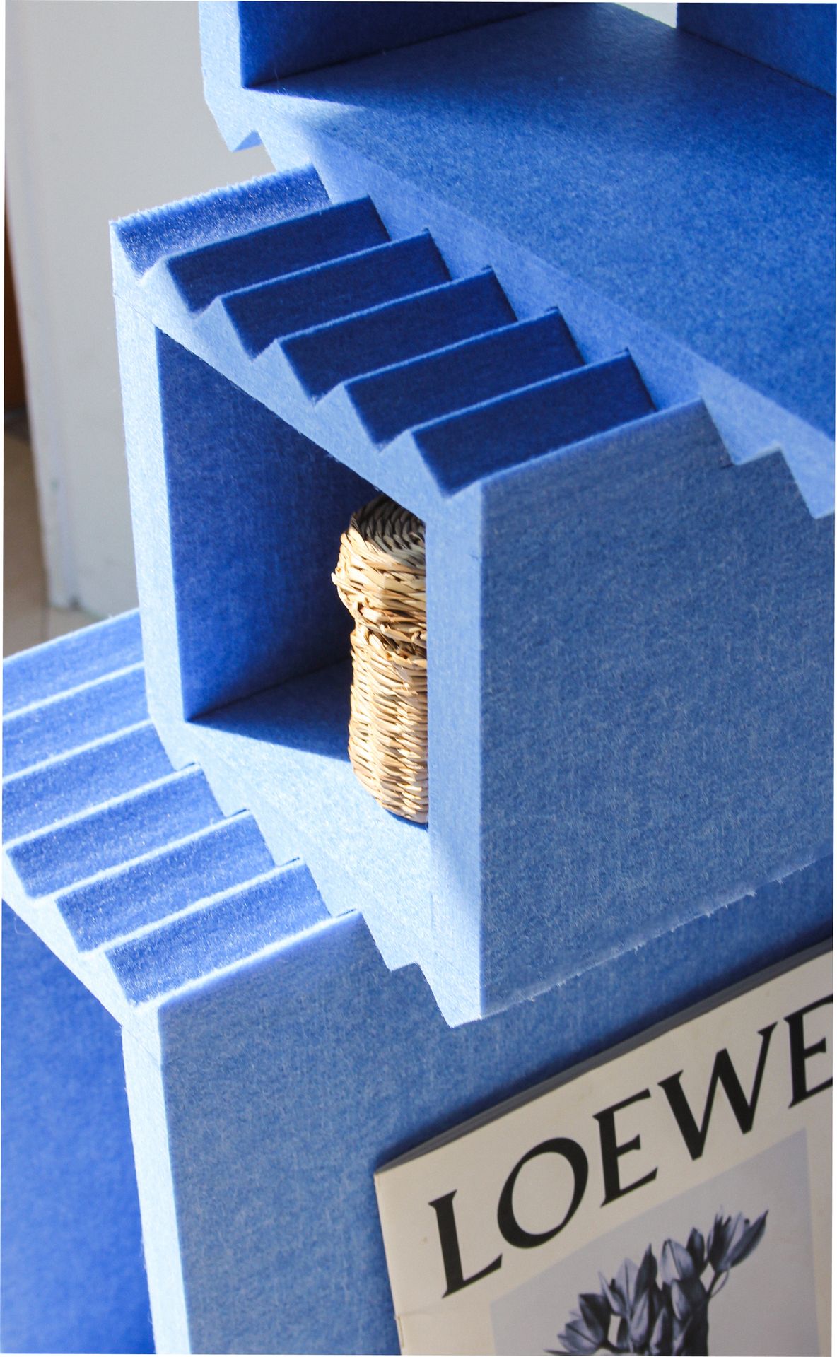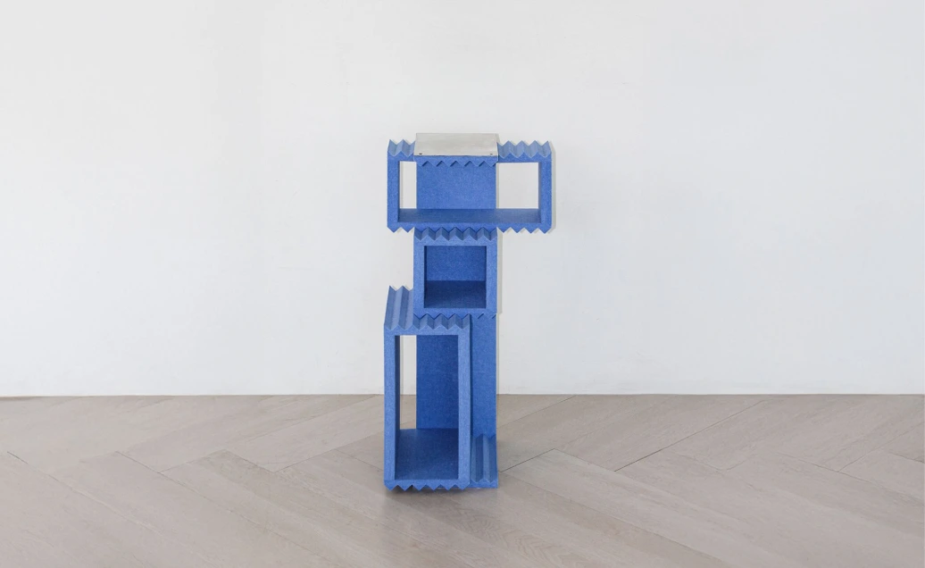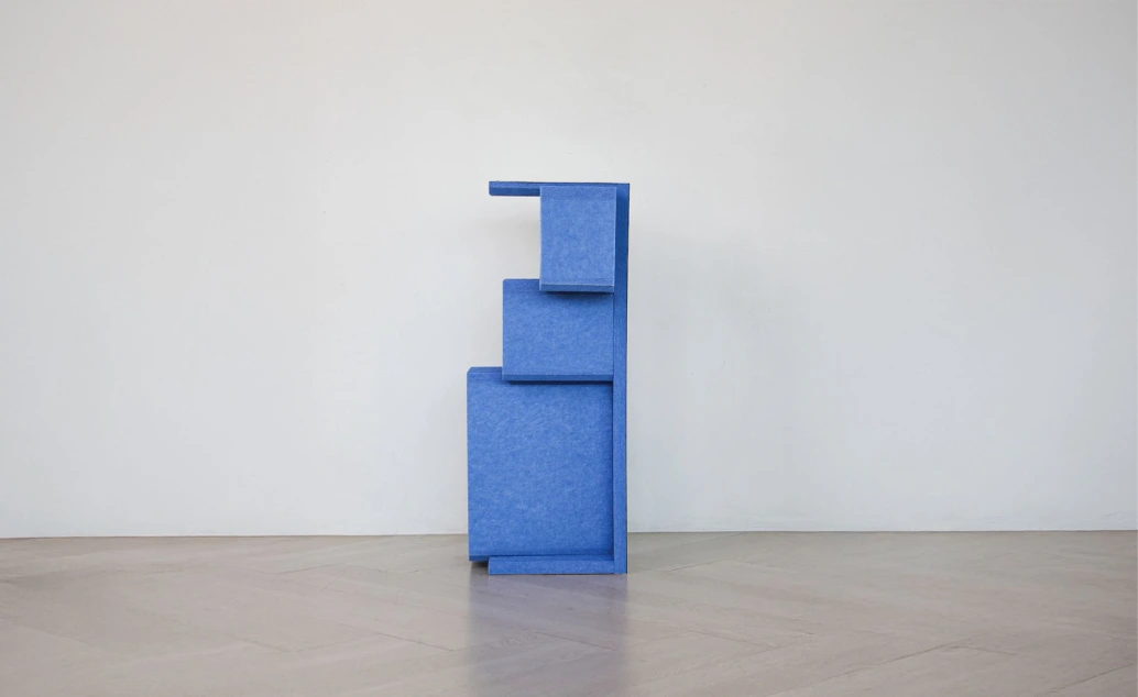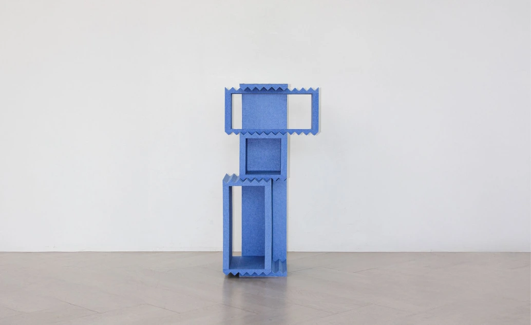 재생 PET 보드의 마찰력을 구조적으로 활용한 모듈형 선반입니다. V-커팅으로 가공된 보드를 기반으로 Frame과 3종의 Unit, 총 4가지 파츠를 조합해 사용자의 의도에 따라 자유로운 레이아웃 구성이 가능합니다. 벽에 고정하거나 바닥에 세워 사용하는 등 다양한 설치 방식에 대응하며, V-커팅 패턴은 Unit 간 결합을 하기 위한 연결 모듈로 작동하는 동시에, 수납물을 배치하는 자연스러운 가이드 역할을 합니다. 반복되는 커팅 면에서 발생하는 음영 대비는 보드에 독특한 볼륨감을 부여해 기능과 조형이 드러나는 오브제로 작동합니다.